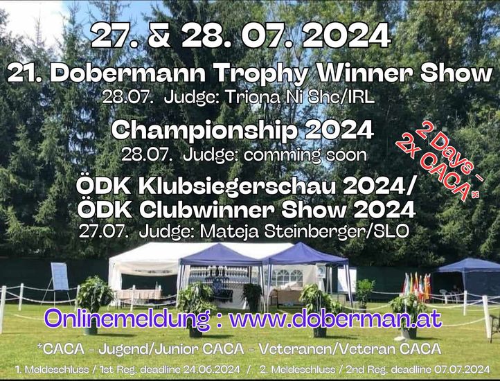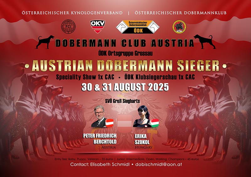 Ing.Rainer Adelsberger mit seiner Julia und zwei prachtvolle braune Dobis Hzw Roland Reisinger bei Übergabe des Klubgeschenkes am Hochzeitstag ------------------------------ ZUCHTSTATISTIK FÜR DAS JAHR 2020 ------------------------------ #BUNDESMEISTERSCHAFT 2020 und KLUBSIEGERSCHAU 2020 agbesagt! ----------------------------------------- Bundesmeisterschaft 2019 ÖDK Bdm 5.Okt 2019 IBGH1 2 Starter IBGH3 6 Starter IGP 3 (Fä UO Schutz) 5 Starter Alle IGP Antretenden haben sich für die WM 2020 qualifiziert --- Die WM 2020 musste leider abgesagt werden!
